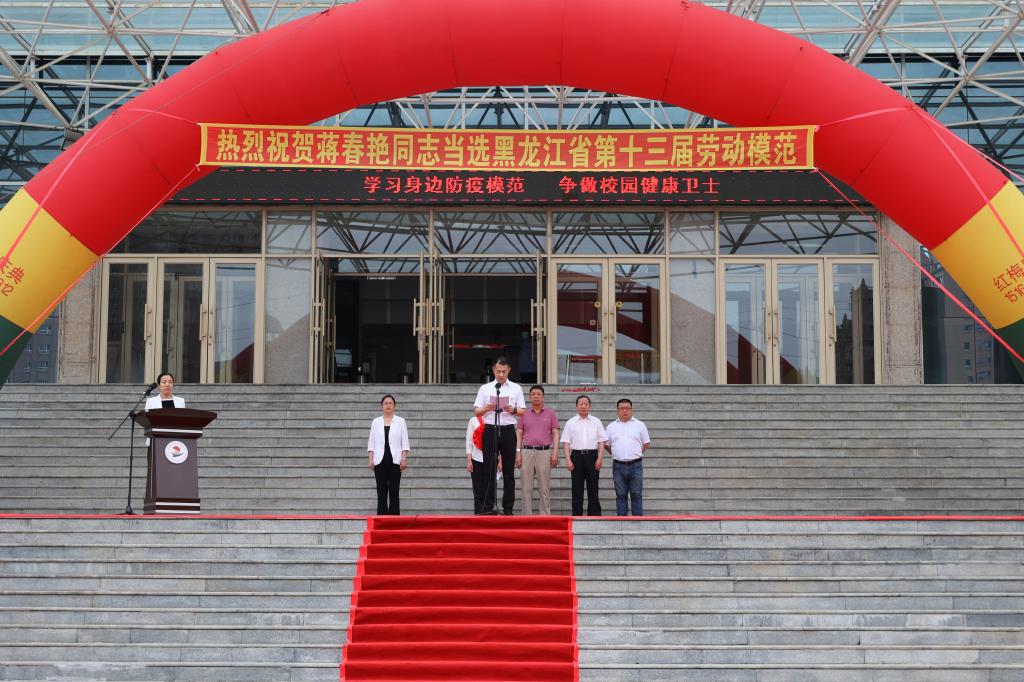 校党委书记郭伟东代表学校向省第十三届劳动模范获得者蒋春艳同志表示祝贺,向辛勤工作在全校各个岗位上的教职工致以崇高的敬意。
