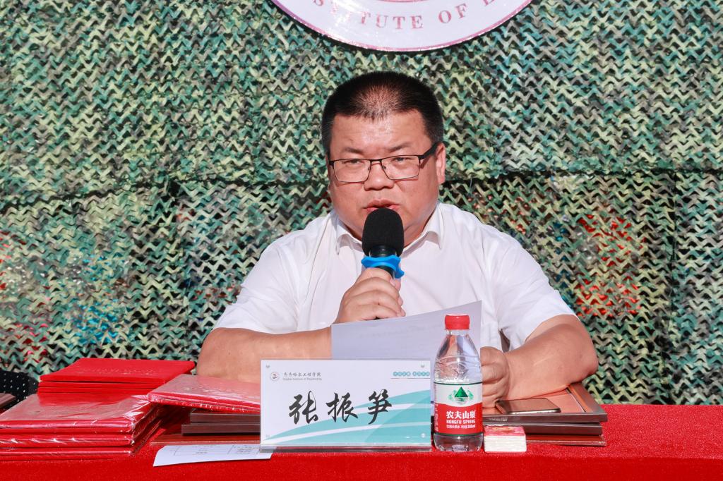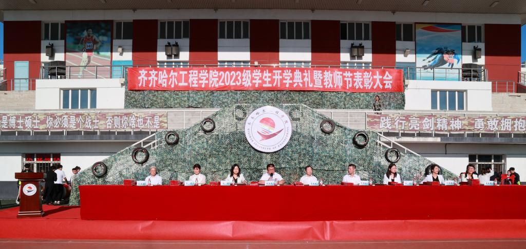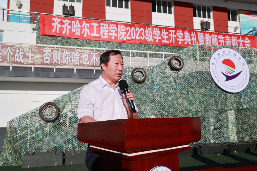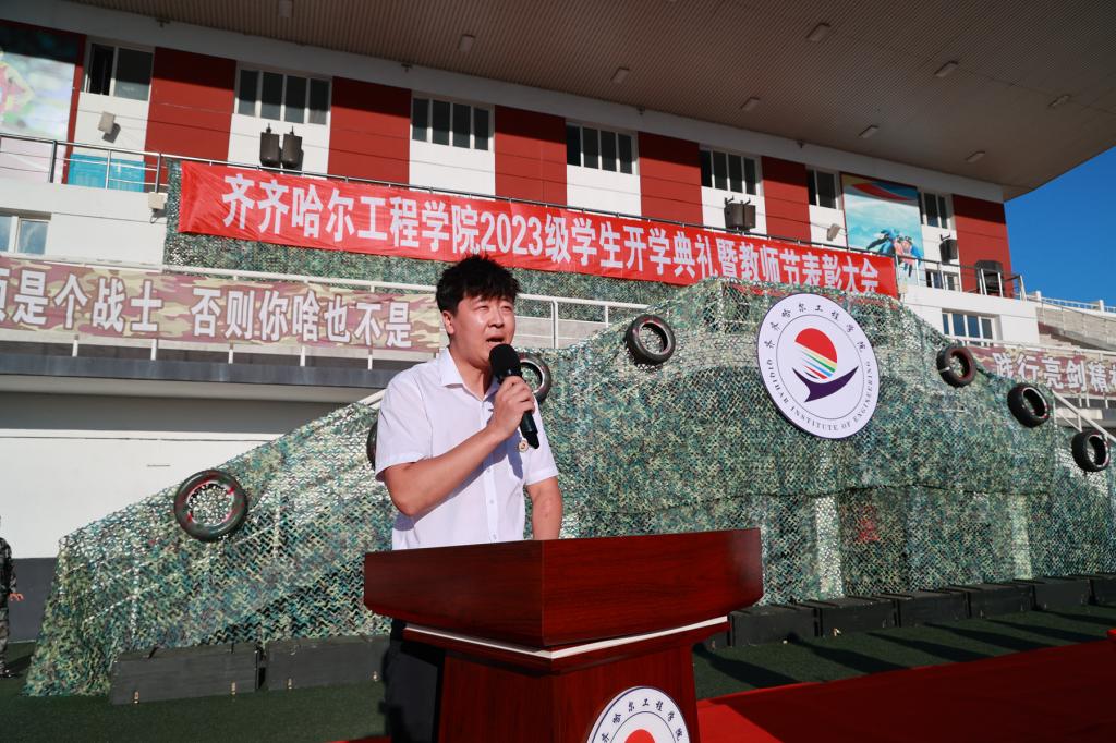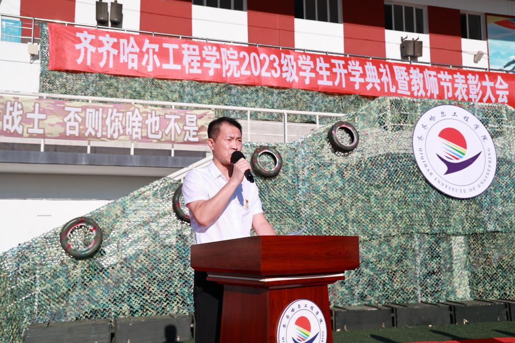 院长曹然彬在会上发表讲话,曹院长对学生军训成果做出了高度评价,充分肯定同学们在军训汇演中的精神风貌。阐释齐齐哈尔工程学院鲜明办学特色:学校是一所创业型的大学,师生共同创业;学校是一所“全员皆教、人人皆师”的学校,生涯导师制陪伴始终;学校倡导“亮剑精神”,希望同学们勇往直前,做最好的自己。曹院长回顾学校32年创业历程,高度评价学校“奋发向上、敢于亮剑”的精神,问候学校教师们教师节快乐,祝福教师生活幸福。